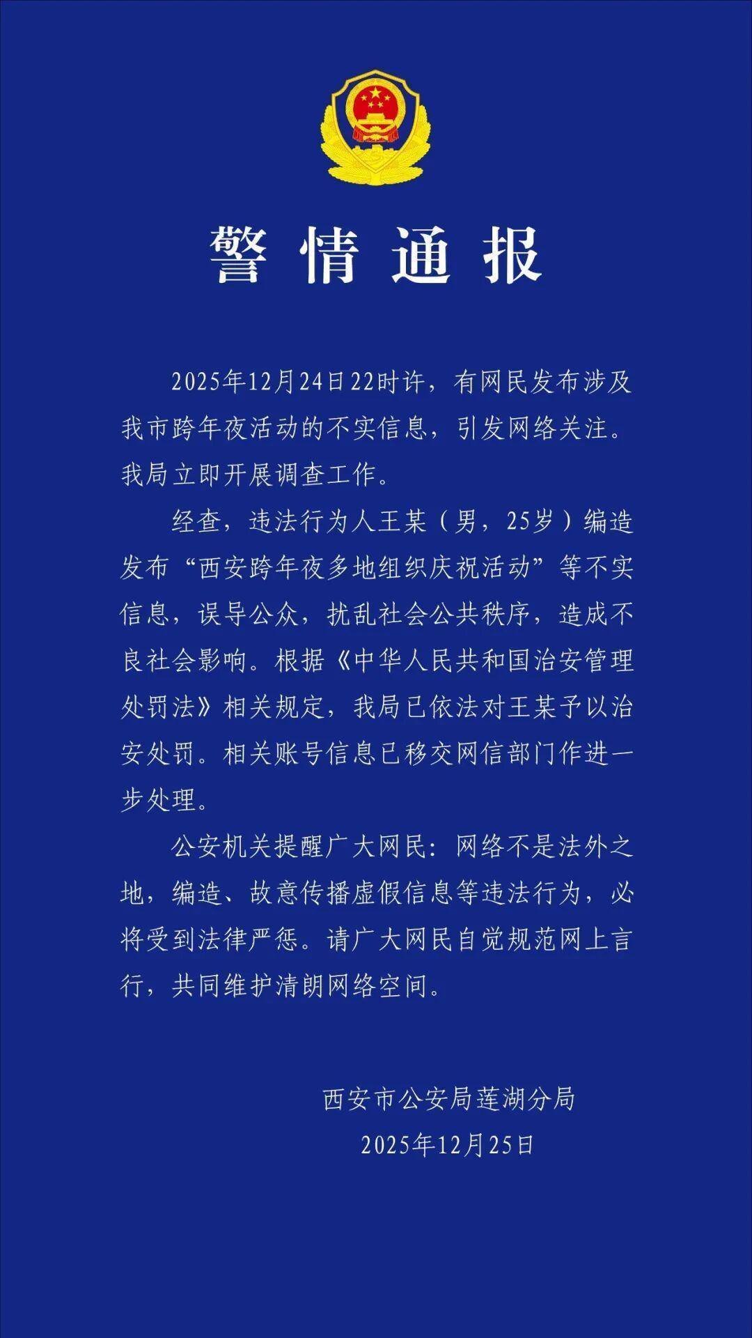 经查,违法行为人王某(男,25岁)编造发布“西安跨年夜多地组织庆祝活动”等不实信息,误导公众,扰乱社会公共秩序,造成不良社会影响。根据《中华人民共和国治安管理处罚法》相关规定,我局已依法对王某予以治安处罚。相关账号信息已移交网信部门作进一步处理。
