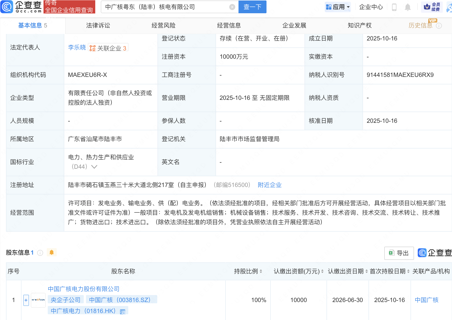 近日,中广核粤东(陆丰)核电有限公司成立,注册资本1亿元,经营范围包含:发电机及发电机组销售;机械设备销售等。企查查股权穿透显示,该公司由中国广核(003816)全资持股。