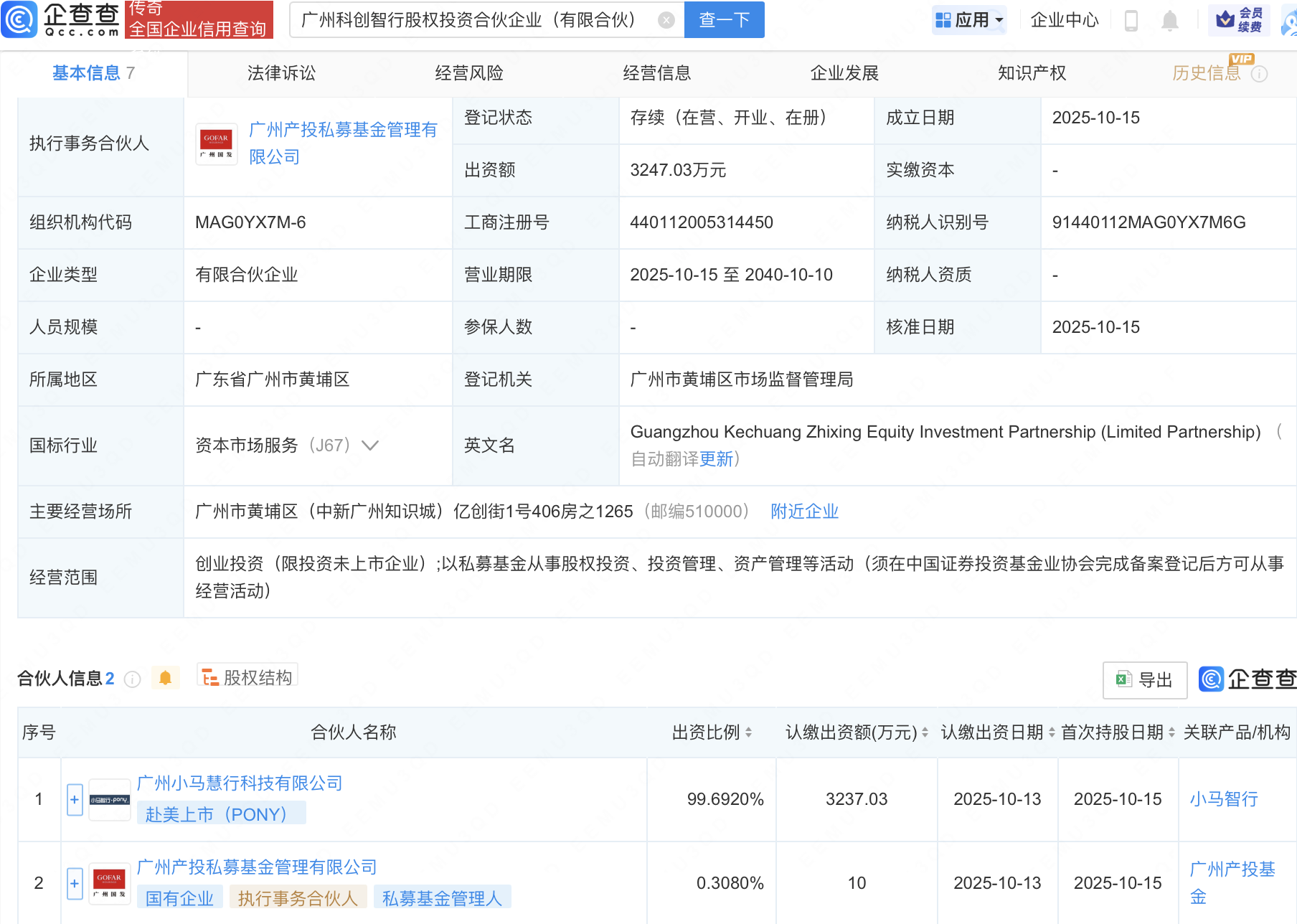 近日,广州科创智行股权投资合伙企业(有限合伙)成立,经营范围包含:创业投资(限投资未上市企业);以私募基金从事股权投资、投资管理、资产管理等活动。企查查股权穿透显示,该企业由广州小马慧行科技有限公司等共同出资。